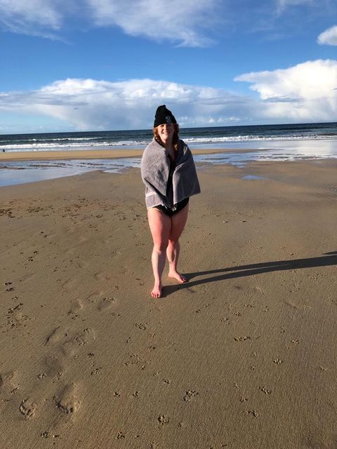 I am standing on Aberdeen Beach in my swimming costume, red hair braided under a small, black beanie. It is January and it is snowing. Light flakes fall softy and slumber between my pink toes.